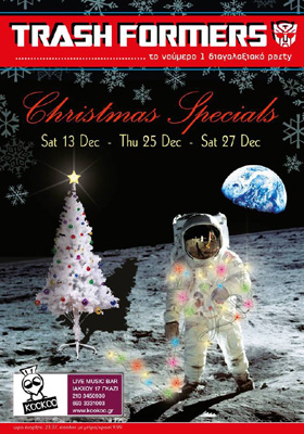 Η αρχή γίνεται το Σάββατο 13 Δεκεμβρίου με ένα… λαμπρό party, ανάβοντας τα λαμπιόνια του KooKoo, για να συνεχιστεί ανήμερα Χριστουγέννων στις 25/12 με το κλασικό event των Trashformers και να κορυφωθεί δυο μέρες μετά, στις 27/12 με ένα μεγάλο διπλό after-christmas και pre-new-year’s-eve event.Με τον τρόπο αυτό και με πολλές εκπλήξεις οι Trashformers αποχαιρετούν δυνατά και εκκωφαντικά το 2014.