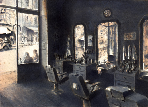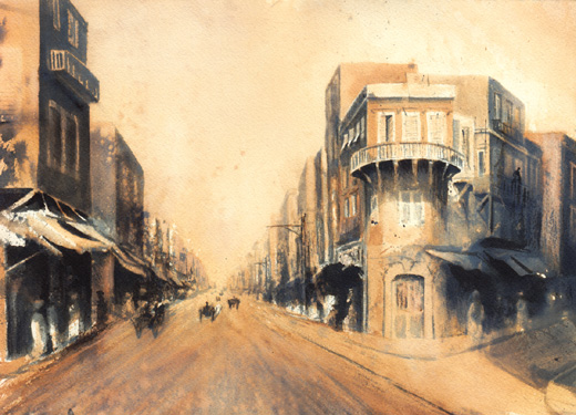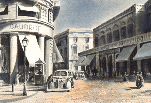 Μετά από μεθοδική έρευνα σε πλούσιο αρχειακό υλικό, καλλιτέχνης ανασυνθέτει με τη ζωγραφική του, την εποχή της δεκαετίας του 1940, μέσα από σημεία-ορόσημα της πόλης που περιγράφει ο συγγραφέας στην τετραλογία: θέατρα, καφενεία, παραλίες, εστιατόρια, δρόμους, πλατείες, ξενοδοχεία, μπαρμπέρικα, σπίτια, λιμάνια, σταθμούς τρένων, καθώς και στιγμιότυπα των πρωταγωνιστών του έργου.