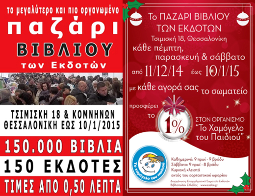 Το Επαγγελματικό Σωματείο Εκδοτών Βιβλιοπωλών Ελλάδος με τη συνεργασία 150 εκδοτικών οίκων προσφέρει ξανά στην Θεσσαλονίκη (Τσιμισκή 18 & Κομνηνών γωνία, πρώην κτίριο NOTOS GALLERY Λαμπρόπουλος) χιλιάδες βιβλία, όλων των κατηγοριών, για όλες τις ηλικίες, σε χαμηλές τιμές που αρχίζουν από 0,50 ευρώ.