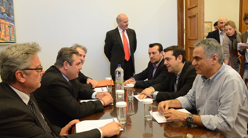 Ο Γ. Αποστολόπουλος όρθιος δεξιά του Ν. Μαριά παρακολουθεί τη συνομιλία Τσίπρα-Καμμένο