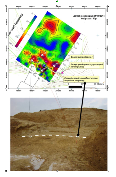 Είναι φανερό ότι η ανωμαλία της τομογραφίας οφείλεται στον αμμώδη γεωλογικό σχηματισμό. Να σημειωθεί ότι οι ανωμαλίες με τις υψηλές τιμές αντίστασης, οι οποίες φαίνονται στο βόρειο τμήμα της οριζόντιας τομής δεν αξιολογούνται, επειδή είναι μέσα στους φυσικούς σχηματισμούς.