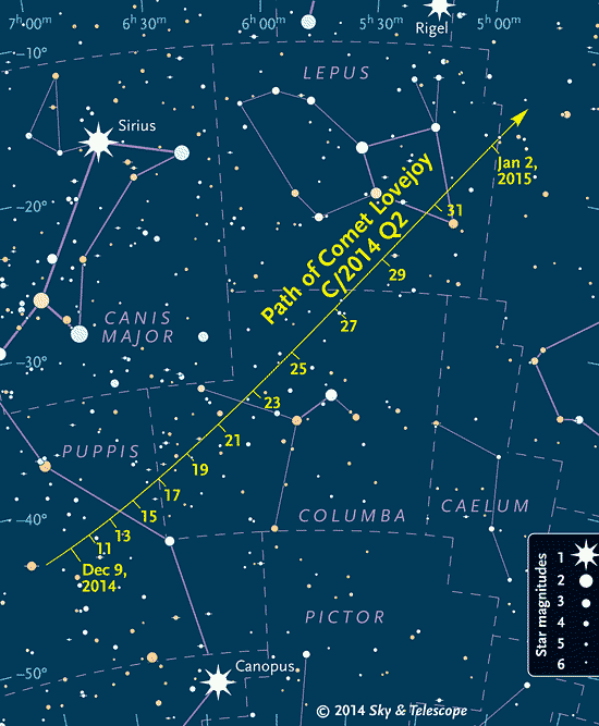 Για τους τυχερούς που βρίσκονται σε περιοχές χωρίς φωτορύπανση, μια πρασινωπή φωτεινή κουκκίδα κάνει ποδαρικό στον ουρανό λίγες νύχτες μετά την Πρωτοχρονιά. Είναι ο κομήτης Lovejoy 20014 Q2, ο οποίος θα παραμείνει στο στόχαστρο των αστρονόμων μέχρι τα τέλη Ιανουαρίου.