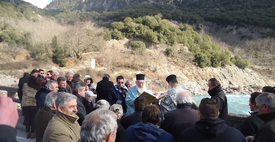 Πλήθος κόσμου παρακολούθησε την τελετή αγιασμού των υδάτων δίπλα από τα ερείπια της θρυλικής Γέφυρας Κοράκου στην Κοιλάδα του Αχελώου.
