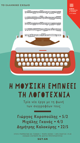 Το ΕΛΛΗΝΙΚΟ ΣΧΕΔΙΟ στην προσπάθεια να υποστηρίξει την πρωτογενή δημιουργία και τη διάδραση των τεχνών μεταξύ τους προσεγγίζει το χώρο της λογοτεχνίας. Follow @ingrBook!function(d,s,id){var js,fjs=d.getElementsByTagName(s)[0];if(!d.getElementById(id)){js=d.createElement(s);js.id=id;js.src=»//platform.twitter.com/widgets.js»;fjs.parentNode.insertBefore(js,fjs);}}(document,»script»,»twitter-wjs»); Τρεις σημαντικοί συγγραφείς, καλούνται να γράψουν διηγήματα με έμπνευση τη μουσική. Οι Γιώργος Κοροπούλης (5 Φεβρουαρίου), Μιχάλης Γκανάς (4 Μαρτίου) και Δημήτρης Καλοκύρης (22 Μαΐου) θα διαβάσουν οι ίδιοι τα […]