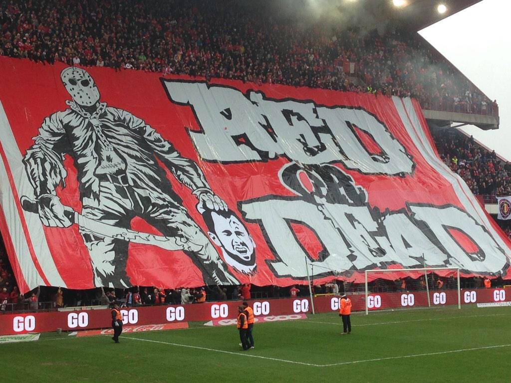 Συγκεκριμένα στον αγώνα των δύο ομάδων, στο πέταλο των οργανωμένων υψώθηκε πανό, το οποίο έδειχνε έναν μασκοφορεμένο άνδρα, ο οποίος στο ένα χέρι κρατούσε ένα σπαθί και στο άλλο το... κομμένο κεφάλι του Ντεφούρ με την επιγραφή «κόκκινος ή νεκρός».
