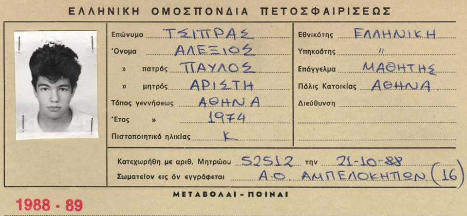 Όπως φαίνεται και στην κεντρική φωτογραφία, σε ηλικία 14 ετών (ημερομηνία έκδοσης του δελτίου αναφέρεται η 21η Οκτωβρίου 1988) ο πρόεδρος του ΣΥΡΙΖΑ, κατεχωρήθη στα αρχεία της Ομοσπονδίας Βόλεϊ ως αθλητής του Α.Ο. Αμπελοκήπων με αριθμό μητρώου 52512.