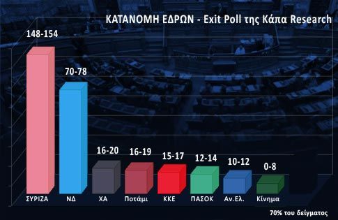 H ΚΑΠΑ Research έδωσε με το που έκλεισαν οι κάλπες προβάδισμα στον ΣΥΡΙΖΑ με διαφορά από 8,5-9,5 ποσοστιαίων μονάδων. Ο ΣΥΡΙΖΑ λαμβάνει 33,5-37,5%, με τη ΝΔ να ακολουθεί με 25-28%. Την τρίτη θέση με ποσοστό 5,5-7,5% καταλαμβάνει η Χρυσή Αυγή, ενώ με μικρότερα ποσοστά ακολουθούν Ποτάμι, ΠΑΣΟΚ, ΚΚΕ και ΑΝΕΛ. Στο όριο του 3% δίνει μάχη το Κίνημα Δημοκρατών Σοσιαλιστών.