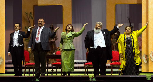![]() | Στη νέα παραγωγή της Εθνικής Λυρικής Σκηνής την ευθύνη της μουσικής διεύθυνσης μοιράζονται οι Ανδρέας Τσελίκας και Γιώργος Αραβίδης, ενώ τη σκηνοθεσία υπογράφει ο Βασίλης Παπαβασιλείου. Τα σκηνικά και τα κοστούμια είναι του Γιώργου Ζιάκα, ενώ οι φωτισμοί της Ελευθερίας Ντεκώ. Πρωταγωνιστούν καταξιωμένοι Έλληνες μονωδοί όπως, μεταξύ άλλων, οι Έλενα Κελεσίδη, Δημήτρης Πακσόγλου, Γεωργία Ηλιοπούλου, Βαγγέλης Χατζησίμος κ.ά. |
