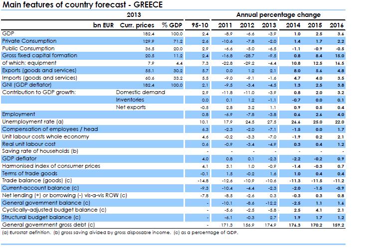 Η Επιτροπή εκτιμά πως η ελληνική οικονομία αναπτύχθηκε κατά 1% το 2014 και θα αναπτυχθεί περαιτέρω στο 2,5% το 2015 και στο 3,6% το 2016. Ξεκαθαρίζει ωστόσο πως οι προβλέψεις αυτές προετοιμάστηκαν επί τη βάσει της πλήρους εφαρμογής των δεσμεύσεων του προγράμματος οικονομικής προσαρμογής.