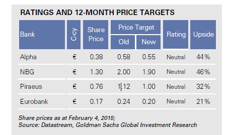 Στο πλαίσιο αυτό η αμερικανική επενδυτική τράπεζα προχωρεί στην υποβάθμιση των τιμών -στόχων των μετοχών των Alpha Bank, Eurobank, Εθνική Τράπεζα και Τράπεζα Πειραιώς, ενώ υποβαθμίζει σε Neutral από Buy τις αξιολογήσεις των Alpha και Εθνική. Η τιμή της Alpha Bank μειώνεται πλέον από τα 0,58 στα 0,55 ευρώ, η τιμή στόχος της Eurobank στα 0,20 ευρώ από τα 0,24 ευρώ, η τιμή στόχος της Τράπεζας Πειραιώς μειώνεται στο 1 ευρώ από 1,12 ευρώ και η τιμή της Εθνικής στο 1,90 από τα 2 ευρώ.