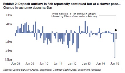 Η επενδυτική τράπεζα εκτιμά πως τον Φεβρουάριο οι εκροές καταθέσεων θα αγγίξουν τα 3 δισ. ευρώ ανεβάζοντας στα 18 δισ. ευρώ τις συνολικές εκροές από τις αρχές Δεκεμβρίου 2014.