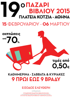 Με κεντρικό σύνθημα «Δικαίωμα στην ανάγνωση!», ανοίγει την Κυριακή 15 Φεβρουαρίου 2015, το 19ο Παζάρι Βιβλίου για να υποδεχθεί χιλιάδες βιβλιόφιλους. Follow @ingrBook !function(d,s,id){var js,fjs=d.getElementsByTagName(s)[0];if(!d.getElementById(id)){js=d.createElement(s);js.id=id;js.src=»//platform.twitter.com/widgets.js»;fjs.parentNode.insertBefore(js,fjs);}}(document,»script»,»twitter-wjs»); Η συνάντηση αναγνωστριών/ών και βιβλίων πραγματοποιείται στην Πλατεία Κοτζιά (Εθνικής Αντίστασης) τού Δήμου Αθηναίων, με θέα το νεοκλασικό Δημαρχείο της Πόλης και συνδιοργανώνεται από τον Σύνδεσμο Εκδοτών Βιβλίου (Σ.ΕΚ.Β.) και […]