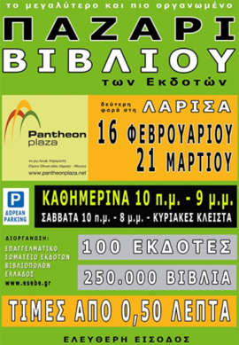 Το Επαγγελματικό Σωματείο Εκδοτών – Βιβλιοπωλών Ελλάδος (Ε.Σ.Ε.Β.Ε.) διοργανώνει, για δεύτερη φορά, και με την συμμετοχή 100 εκδοτικών οίκων, παζάρι βιβλίου στην Λάρισα, στο εμπορικό κέντρο Pantheon Plaza.