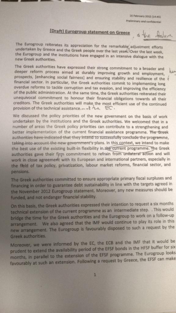 Το κείμενο αυτό μιλούσε για επέκταση της δανειακής σύμβασης δίνοντας ένα περιθώριο 4 μηνών ως γέφυρα για ένα νέο πρόγραμμα. «Σε αυτή τη βάση, θα είμαστε περισσότερο από ευτυχείς να υπογράψουμε» με μόνη προϋποθέση, όπως είπε, να μην ληφθούν νέα υφεσιακά μέτρα σε αυτήν την περίοδο.