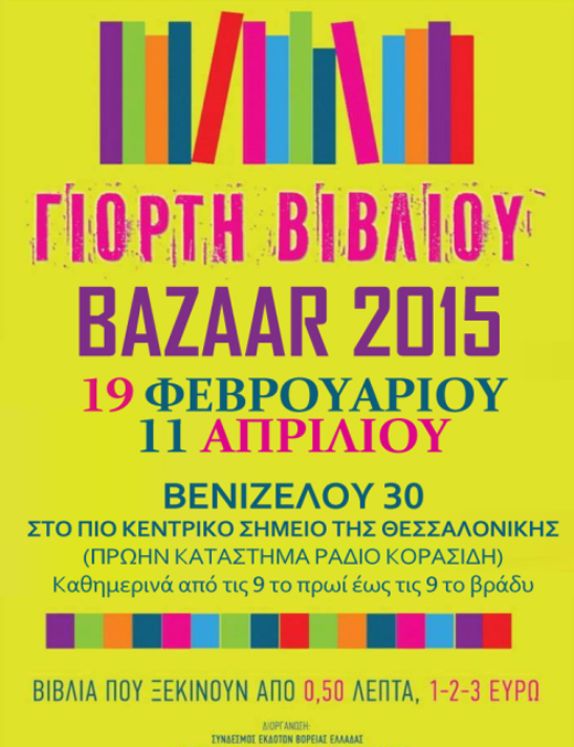 Την Πέμπτη 19 Φεβρουαρίου 2015 ξεκινά τη λειτουργία της η 7η Γιορτή Βιβλίου – Παζάρι 2015, με 180 εκδότες και με το σύνθημα «φθηνό και καλό βιβλίο για όλους» και οργανώνεται από το Σ.ΕΚ.Β.Ε.