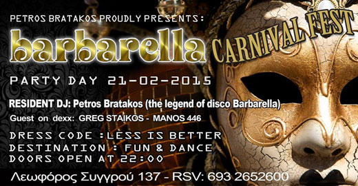 Η disco Βarbarella επιστρέφει στον ιστορικό χώρο που υπήρξε τη δεκαετία του ‘80 το Playboy –και λίγο πιο δίπλα από το νούμερο 253 της Λεωφ. Συγγρού όπου στεγαζόταν- για ένα μεγάλο μασκέ πάρτι το τελευταίο Σάββατο της Αποκριάς 21/2 και με DJ τον θρυλικό resident DJ της εποχής εκείνης, Petros Bratakos.