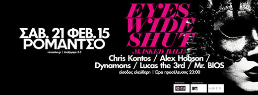 Εμπνευσμένο από το ερωτικό θρίλερ του Stanley Kubrick και την περιβόητη σκηνή του πάρτι, το Ρομάντσο σας καλεί να φορέσετε τη μάσκα σας και να αφεθείτε στο μυστηριώδες πάρτι του το Σάββατο 21 Φεβρουαρίουυ. Απαραίτητη προϋπόθεση είναι να συμφωνήσετε πως ό,τι γίνει στο πάρτι θα παραμείνει μέσα στους τοίχους του Ρομάντσο και μόνο! Βενετσιάνικες μάσκες, φτερά, μανδύες, ερωτισμός, υποβλητική μουσική, μαύρο, χρυσό και κόκκινο συνθέτουν την απαιτούμενη μυστηριώδη ατμόσφαιρα που θα ζήσετε αν φορέστε τη μάσκα σας και χρησιμοποιήστε το μυστικό κωδικό (Τομ Κρουζ) για να εισέλθετε στο πάρτι. DJ sets της βραδιάς οι: Chris Kontos, Alex Hobson, Dynamons, Lucas the 3rd και Mr. BIOS