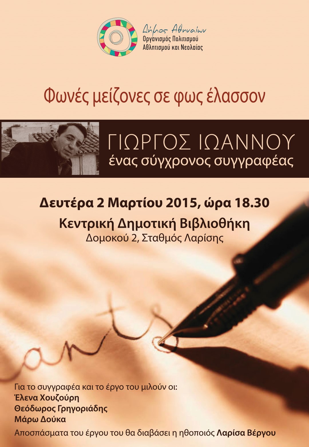 Η πρώτη εκδήλωση με τίτλο «Γιώργος Ιωάννου: Ένας σύγχρονος συγγραφέας» θα πραγματοποιηθεί τη Δευτέρα 2 Μαρτίου. Για το συγγραφέα και το έργο του μιλούν οι Έλενα Χουζούρη, Θεόδωρος Γρηγοριάδης και Μάρω Δούκα. Αποσπάσματα του έργου του θα διαβάσει η ηθοποιός Λαρίσα Βέργου.