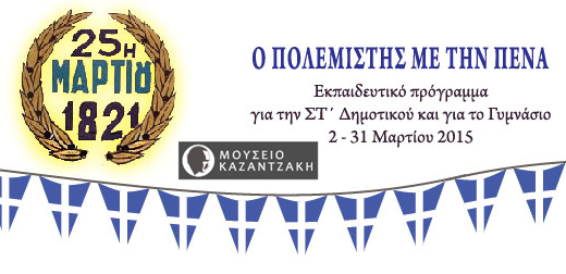 Το Μουσείο Καζαντζάκη, με αφορμή την Επέτειο της 25ης Μαρτίου, προσφέρει το νέο εκπαιδευτικό πρόγραμμα «Ο πολεμιστής με την πένα» για όλο το Μάρτιο του 2015 (2-31/3).