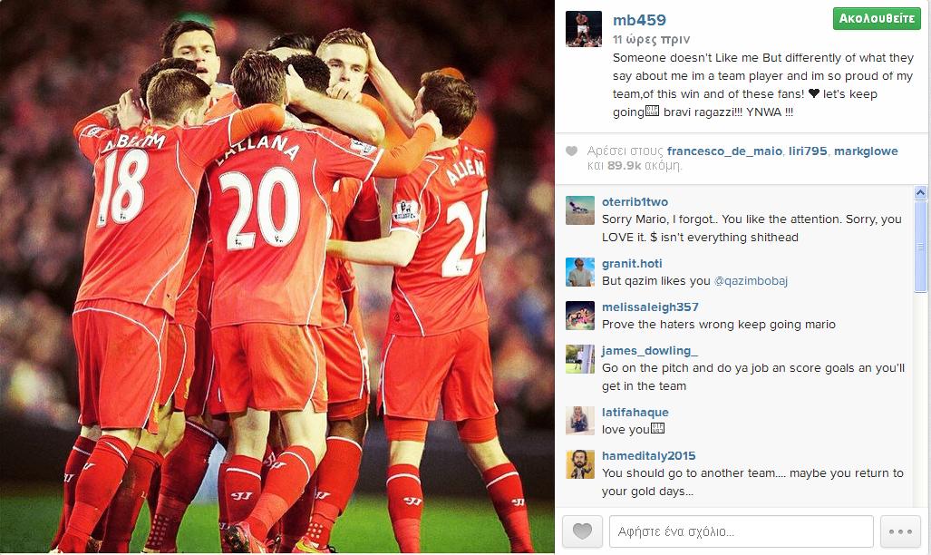 «Καρφιά» κατά πάσα πιθανότητα στον προπονητή του, Μπρένταν Ρότζερς, έριξε ο Μάριο Μπαλοτέλι, μετά τον αγώνα της Λίβερπουλ απέναντι στην Μπέρνλι όπου οι «κόκκινοι» κέρδισαν με 2-0, όμως ο Ιταλός δεν αγωνίστηκε ούτε λεπτό. Μετά τη λήξη του αγώνα ο 24χρονος επιθετικό «χτύπησε» μέσω του προσωπικού του λογαριασμού στο instagam, όπου μεταξύ άλλων έγραψε πως σε κάποιον δεν αρέσει.