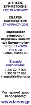 Στοιχεία επικοινωνίας: Μαρία Θεοδωρίδου, T 210 32 17 929, F 210 32 17 686, E ergastiria@ianos.gr