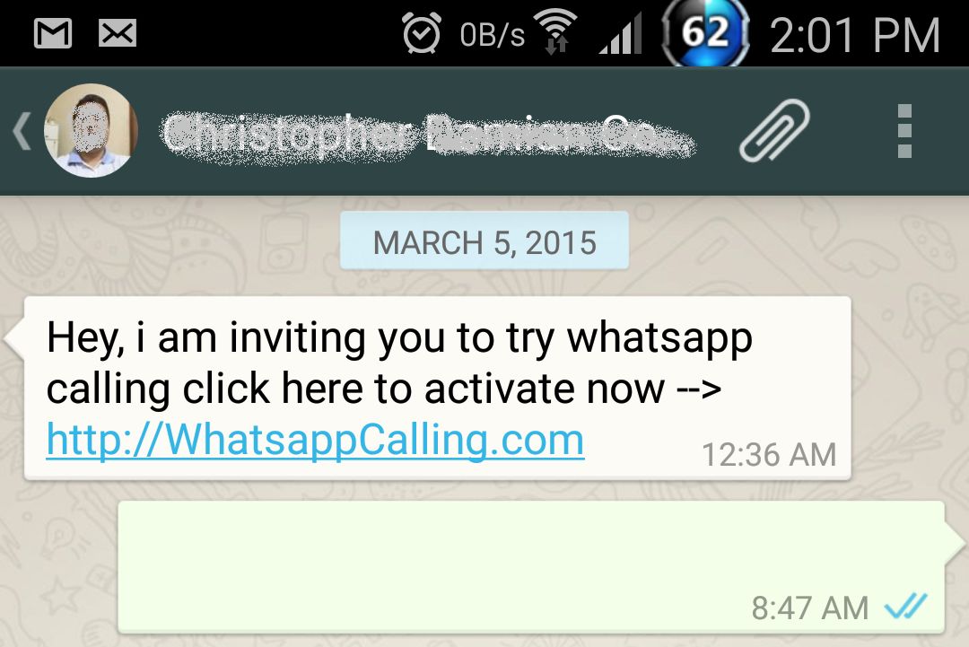 Εάν λάβετε το μήνυμα ’Hey, I am inviting you to try whatsapp Calling click here to activate now—> http://WhatsappCalling.com’, (ή με διαφορετική παραπομπή), δεν θα πρέπει να κάνετε κλικ.