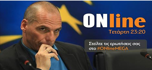 Το πιο πολυσυζητημένο πρόσωπο των ημερών, ο υπουργός Οικονομικών Γιάνης Βαρουφάκης, καλεσμένος στην πρεμιέρα της εκπομπής “OΝline”, με την Όλγα Τρέμη και τον Νίκο Ευαγγελάτο, στο MEGA. Παρακολουθήστε σχετικό απόσπασμα: Σε μια συνέντευξη εφ’ όλης της ύλης, ο υπουργός Οικονομικών, ο πολιτικός που έγινε πρωτοσέλιδο στα μέσα ενημέρωσης όλου του κόσμου, δημιουργώντας φανατικούς υποστηρικτές αλλά […]