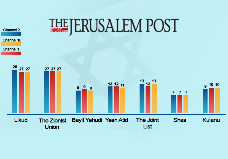 Το Channel 10 δίνει από 27 έδρες σε Λικούντ και Σιωνιστική Ένωση. Δίνει επίσης 13 έδρες στην Αραβική Λίστα, 11 στο Γες Ατίντ, 10 στο Κουλάνου, 8 στον Εβραϊκό Οίκο, 5 στο Μερέτζ, 5 στο κόμμα του Λίμπερμαν και 7 στο Σας.