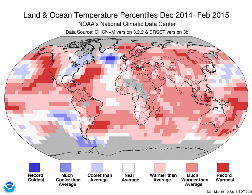 Βάσει των στοιχείων αυτών, κατά την περίοδο ανάμεσα στον Δεκέμβριο 2014 έως το Φεβρουάριο 2015 η μέση θερμοκρασία παγκοσμίως ήταν 0,79 βαθμούς Κέλσιου υψηλότερη από το μέσο όρο το 20ού αιώνα.