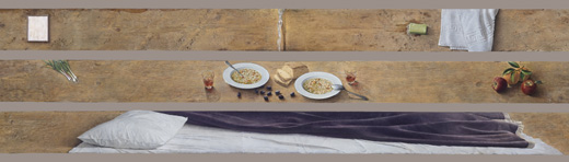 Ζωγράφισα πάνω σε μακρόστενα ξύλα από ορεινές γέφυρες. Καθένα τους μια γέφυρα, ένα κατόρθωμα του ανθρώπου να υπερβαίνει δυσκολίες. Η στενότητα και το μήκος των ξύλων επιλέχηκαν για να υπενθυμίζουν τη στενότητα και το μήκος της οδού που διαβαίνουμε για να φτάσουμε στην άλλη όχθη, απέναντι. Τα πεπατημένα ξύλα, ανακαλούν το πλήθος των αγνώστων που τα περπάτησαν. Πάνω τους η ζωγραφική, επιμελημένο σήμα απ’ το πέρασμά μας, αντιστέκεται στη ζωή που μας δαπανά αδαπάνητη. Ζωγραφισμένοι άνθρωποι σαν κι εμάς αναπαύονται εν μέση οδώ, κοπιώντες και πεφορτισμένοι. Πάνω τους έναστρος ουρανός και κάτω η γη ανθισμένη. Στο βάθος μια πόρτα μισάνοιχτη στο φως, μας καλεί να προχωρήσουμε. Πίσω της τα ελάχιστα απαραίτητα της ζωής, λιτό γεύμα για συντροφιά, ένα στρωμένο κρεββάτι, νερό να ευπρεπιστούμε, λευκή πετσέτα, σαπούνι, ένα καθρεφτάκι να δούμε το πρόσωπό μας καθαρό κι η πόρτα μισάνοιχτη.