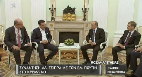 Ολοκληρώθηκαν μετά από δυόμιση ώρες η συνάντηση του πρωθυπουργού Αλέξη Τσίπρα με τον πρόεδρο της Ρωσίας Βλαντιμίρ Πούτιν και στη συνέχεια των αντιπροσωπειών στο Κρεμλίνο. Στις δηλώσεις του πριν την έναρξη των κατ' ιδίαν συνομιλιών, ο πρωθυπουργός αναφέρθηκε στις διαχρονικές σχέσεις που διέπουν τους δύο λαούς, τονίζοντας πως στόχος είναι η επανεκκίνηση των διμερών σχέσεων προς όφελος των δύο χωρών, αλλά και προς όφελος της σταθερότητας και της ασφάλειας στην περιοχή.