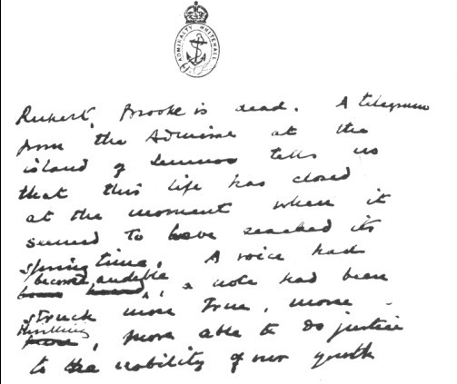 «Ο Ρούπερτ Μπρουκ είναι νεκρός. Ένα τηλεγράφημα του Ναυάρχου από τη Λήμνο μάς πληροφορεί πως αυτή η ζωή έσβησε ακριβώς τη στιγμή που φαινόταν ν’ ανθίζει. Μια φωνή ακούστηκε για μια στιγμή, μια νότα ήχησε πιο αληθινή, πιο συναρπαστική, πιο ικανή να δείξει την ευγένεια της νιότης μας, όπως της έπρεπε» έγραψε ο Τσώρτσιλ.