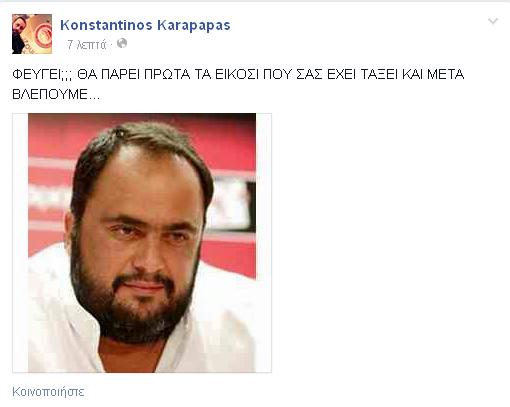 Η ανάρτηση περιέχει μια φωτογραφία του «ισχυρού άνδρα» του Ολυμπιακού με τη λεζάντα: «Φεύγει;;; Θα πάρει πρώτα τα είκοσι που σας έχει τάξει και μετά βλέπουμε…».