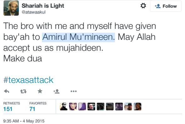 Το μήνυμα έλεγε: «Ο αδερφός κι εγώ δώσαμε όρκο στον αρχηγό των πιστών. Ας μας δεχθεί ο Αλλάχ ως μουτζαχεντίν» και έκλεινε με το hashtag #texasattack.