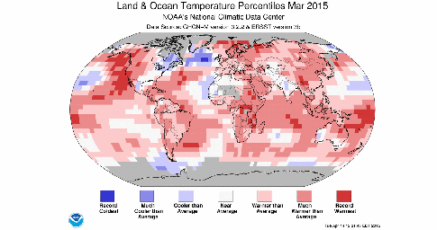Ο Μάρτιος του 2015, και συνολικά το πρώτο τρίμηνο του έτους, ήταν τα θερμότερα για τον πλανήτη από το 1880, οπότε υπάρχουν επίσημα καταγεγραμμένα στοιχεία. Παράλληλα, η έκταση των πάγων στην Αρκτική ήταν μικρότερη από ποτέ για το μήνα Μάρτιο.