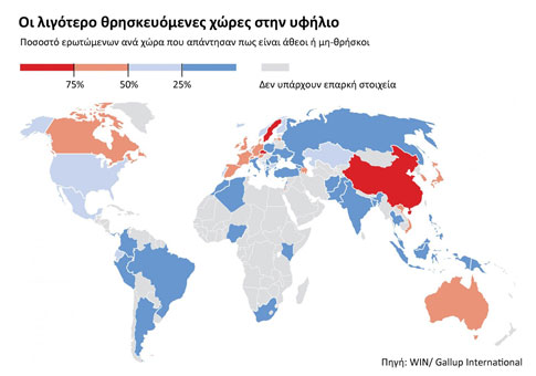 Με κόκκινο είναι οι λιγότερο θρησκευόμενες χώρες (όπως η Κίνα με 90% των ερωτώμενων να δηλώνουν άθεοι, τη Σουηδία με 76%, τη Τσεχία με 75% και το Χονγκ Κονγκ με 70%).