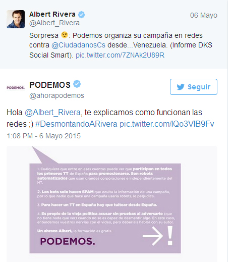 Oι Ciudadanos επανήλθαν, αυτή τη φορά με πιο παραδοσιακό τρόπο. Εκπρόσωπος του κόμματος δήλωσε στις κάμερες: «Δεν είπαμε ότι το Podemos είναι πίσω από την εκστρατεία. Είπαμε ότι το συγκεκριμένο hashtag έχει ιδιαίτερη άνοδο από τη Βενεζουέλα, την οποία άλλωστε οι ίδιοι θαυμάζουν.