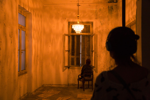Στάση 1η: Το κτήριο του 1907 στην Αριστομένους με τα μπλε κάγγελα. Μπήκα από την μπροστινή πόρτα. Φόρεσα τα ακουστικά που βρήκα στην είσοδο και ακολούθησα πιστά τις οδηγίες για το πώς θα κινηθώ μέσα στο χώρο. Οι ιστορίες των ενοίκων και των γειτόνων με ταξίδεψαν πολλά χρόνια πίσω τότε που το κτήριο λειτουργούσε ως νηπιαγωγείο. Στον 1ο όροφο στο βάθος στο μικρό μπαλκονάκι με περίμενε μία έκπληξη! Μαστίχα και λουκούμι. Στη συνέχεια κατευθύνθηκα σε ένα άδειο δωμάτιο όπου μια γυμνή, ηλικιωμένη γυναίκα ασάλεφτη ατένιζε έξω από ένα μισόκλειστο παράθυρο τα «μεγαλεία μιας άλλης εποχής».