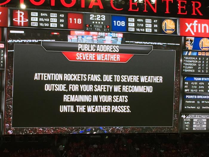 Το βράδυ της Δευτέρας οι Ρόκετς επικράτησαν των Γκόλντεν Στέιτ Ουόριορς στο «Toyota center» μειώνοντας το σκορ της μεταξύ τους σειράς στο 3-1, όμως μετά το τέλος του αγώνα μια δυσάρεστη έκπληξη περίμενε τους οπαδούς της γηπεδούχου ομάδας. Η καταιγίδα που είχε ξεσπάσει λίγες ώρες πριν την έναρξη του αγώνα, δημιούργησε σαρωτικές πλημμύρες στους δρόμους του Χιούστον. Έτσι με σκοπό την ασφάλεια των οπαδών οι Ρόκετς προέτρεψαν μέσω μηνύματος στα μάτριξ του γηπέδου, τους φιλάθλους να παραμείνουν στις θέσεις τους μετά τη λήξη του αγώνα και μέχρι να εξομαλυνθούν τα πράγματα στους δρόμους. Έτσι και έγινε, αρκετοί έφυγαν, όμως κάποιοι επέλεξαν να μείνουν και να περιμένουν, ενώ το ίδιο έκανε και ο σέντερ της ομάδας, Ντουάιτ Χάουαρντ.