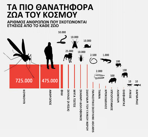 Φυσικά, όπως θα περίμενε κανείς, ο ίδιος ο άνθρωπος είναι ψηλά στη σχετική λίστα, καθώς ευθύνεται για εκατοντάδες θανάτους άλλων ομοειδών του, σε ετήσια βάση. Όμως -κι εδώ είναι η έκπληξη- δεν είναι πρώτος, καθώς στη κορυφή βρίσκεται… το κουνούπι.