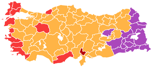 Με κίτρινο χρωματίζονται οι νομοί στους οποίους πλειοψηφεί το ΑΚΡ, με κόκκινο το κεμαλικό Ρεπουμπλικανικό Λαϊκό Κόμμα, με μοβ το φιλοκουρδικό HDP και με βαθύ κόκκινο το Κόμμα Εθνικιστικής Δράσης (Γκρίζοι Λύκοι).