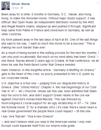 «Viva Tsipras», «Viva New Greece», αναφωνεί μέσω της προσωπικής του σελίδας στο Facebook, ο διάσημος σκηνοθέτης Όλιβερ Στόουν. Υποστηρικτής του έλληνα πρωθυπουργού, ο Όλιβερ Στόουν σε μία μακροσκελή ανάρτηση, γράφει για το «Grexit», κατακεραυνώνει τα αμερικάνικα μέσα ενημέρωσης, αναφέρεται στο «Z» του Κώστα Γαβρά και γιορτάζει μια «νέα Ελλάδα».