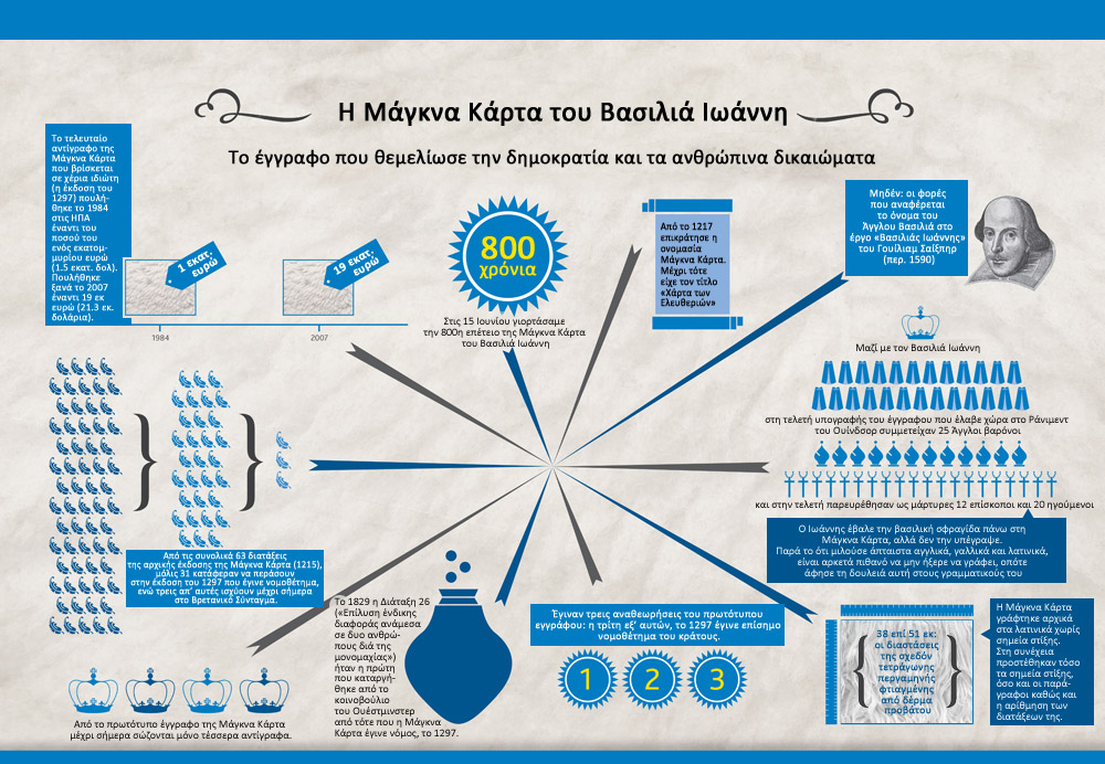 Η Μάγκνα Κάρτα είναι ένας κατάλογος δικαιωμάτων που αναγκάστηκε να παραχωρήσει ο βασιλιάς της Αγγλίας Ιωάννης ο Ακτήμων στους ευγενείς και στον βρετανικό κλήρο αλλά κυρίως στις κατώτερες κοινωνικές τάξεις της εποχής. Όλα όσα θέλετε να μάθετε για αυτόν τον «Χάρτη των Ελευθεριών» σε ένα γράφημα.