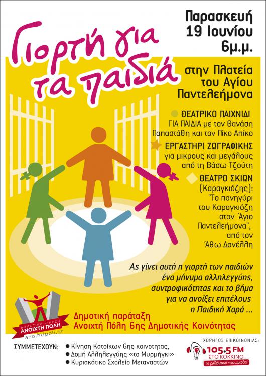 Την παιδική γιορτή στην πλατεία του Αγίου Παντελεήμονα οργανώνει η Ανοιχτή Πόλη της 6ης δημοτικής κοινότητας και τη στηρίζουν η Κίνηση Κατοίκων 6ης κοινότητας, η Δομή Αλληλεγγύης «το Μυρμήγκι» και το Κυριακάτικο Σχολείο Μεταναστών.
