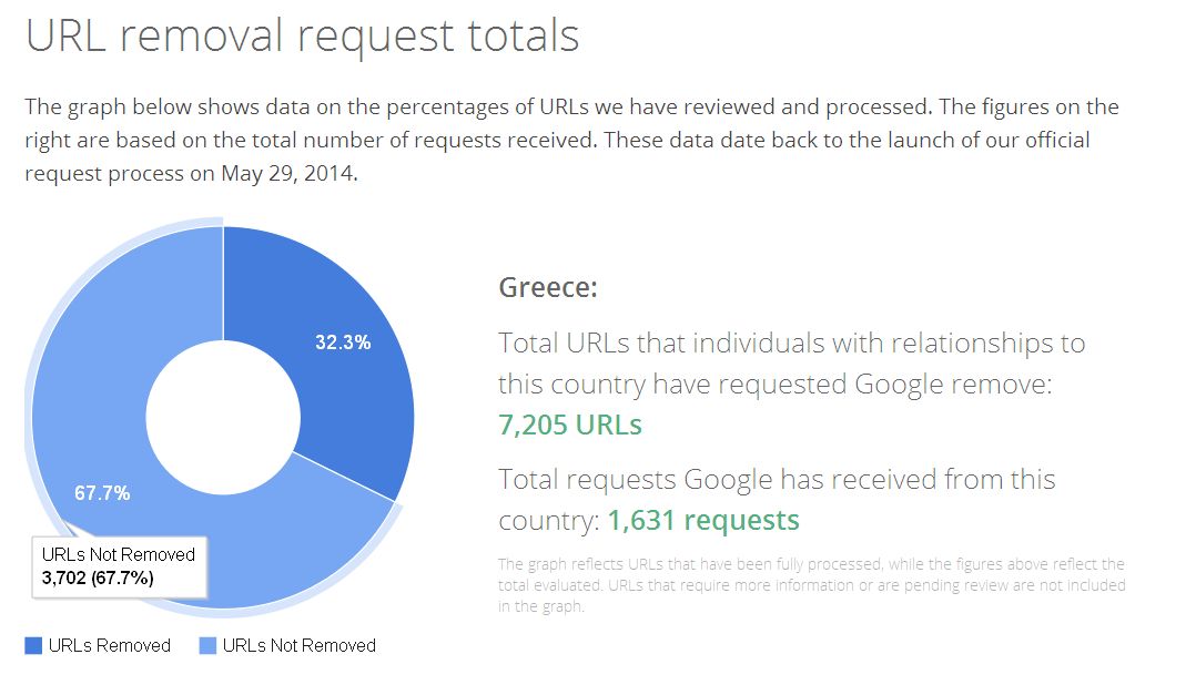 Οι ευρωπαϊκές αρχές έχουν λάβει περί τα 2.000 αιτήματα -στην πλειονότητά τους προς την Google- για να αποφανθούν εάν θα πρέπει να μην εμφανίζονται συγκεκριμένες παραπομπές στα αποτελέσματα με κριτήριο το ονοματεπώνυμο του αιτούμενου από την δημοφιλέστερη μηχανής αναζήτησης στην Ευρώπη. Στόχος τους, να διακρίνουν εάν με την διαγραφή προστατεύεται το δικαίωμα του αιτούντα στο απόρρητο της ιδιωτικής του ζωής και των προσωπικών του δεδομένων ή με την διατήρηση το δικαίωμα του κοινού για ενημέρωση. Δείτε πόσα αιτήματα υποβλήθηκαν από την Ελλάδα και πόσα URL δεν αφαιρέθηκαν από το google.gr στην διεύθυνση http://www.google.com/transparencyreport/removals/europeprivacy/