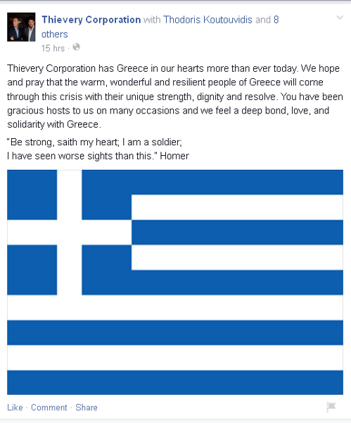 Τη συμπαράσταση του για τις κρίσιμες ώρες που βιώνουν οι Έλληνες τα τελευταία 24ωρα, είχε εκφράσει, μέσα από την επίσημη σελίδα του στο Facebook, το συγκρότημα των Thievery Corporation.