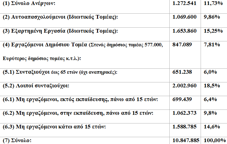 Το πρώτο αναφέρεται στη σύνθεση του Ελληνικού πληθυσμού (Πίνακας 1). Μόνο το 25,11% του συνόλου των 10.847.885 Ελλήνων βρίσκεται σε άμεση σχέση με τη λειτουργία του ιδιωτικού τομέα της Ελληνικής οικονομίας.