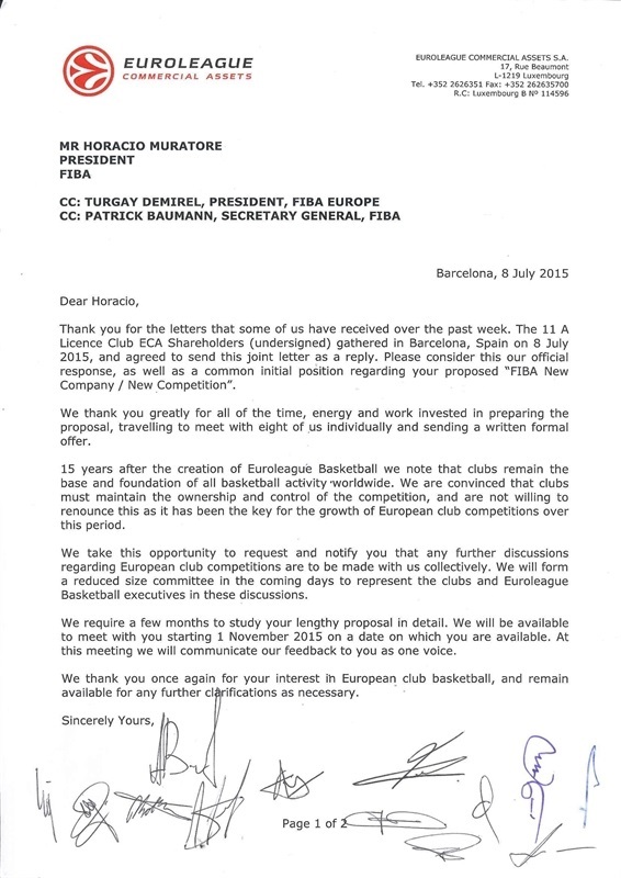 σ ευχαριστούμε για τα γράμματα που λάβαμε από εσένα την τελευταία εβδομάδα. Οι έντεκα (11) ομάδες που έχουν συμβόλαιο τύπου Α συγκεντρωθήκαμε στα κεντρικά της Euroleague στη Βαρκελώνη, την Τρίτη 8 Ιουλίου, και συμφωνήσαμε να σου στείλουμε το παρακάτω ως απάντηση. Παρακαλούμε να το λάβεις υπόψιν ως επίσημη απάντηση από εμάς, όπως επίσης ως τοποθέτηση για τη «νέα διοργάνωση της FIBA».