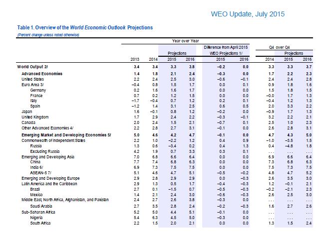Το ΔΝΤ «προσγείωσε» στο 3,3% την εκτίμησή του για την παγκόσμια ανάπτυξη το 2015, έναντι 3,5% που προέβλεπε τον Απρίλιο, ενώ για το 2016 διατήρησε αμετάβλητη την πρόβλεψη για ανάπτυξη της παγκόσμιας οικονομίας κατά 3,8%.