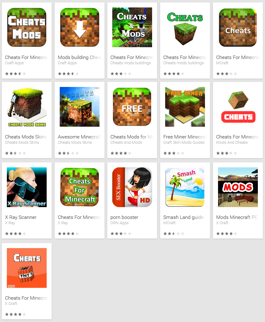 Επίσης, η ίδια εταιρεία ανάπτυξης εφαρμογών αντιμετώπισης των κινδύνων μόλυνσης από κακόβουλο λογισμικό είχε εντοπίσει σειρά apps που εκμεταλλεύονταν το ενδιαφέρον των χρηστών για το παιχνίδι Minecraft. Οι εφαρμογές δεν έκαναν τίποτα περισσότερο από το να τρομάζουν τους χρήστες ότι έχουν μολυνθεί από ιό και πρόσφεραν δήθεν βοήθεια με αντάλλαγμα την ενεργοποίηση συνδρομής σε υπηρεσία αυξημένης χρέωσης αποστολής μηνυμάτων -Premium SMS- με κόστος 4,80 ευρώ την εβδομάδα. Τα apps εντοπίστηκαν στις 22 Μαΐου 2015, ήταν διαθέσιμα από τον Αύγουστο του 2014 και η Google τα απέσυρε από το Play Store μετά την ειδοποίηση της ESET.
